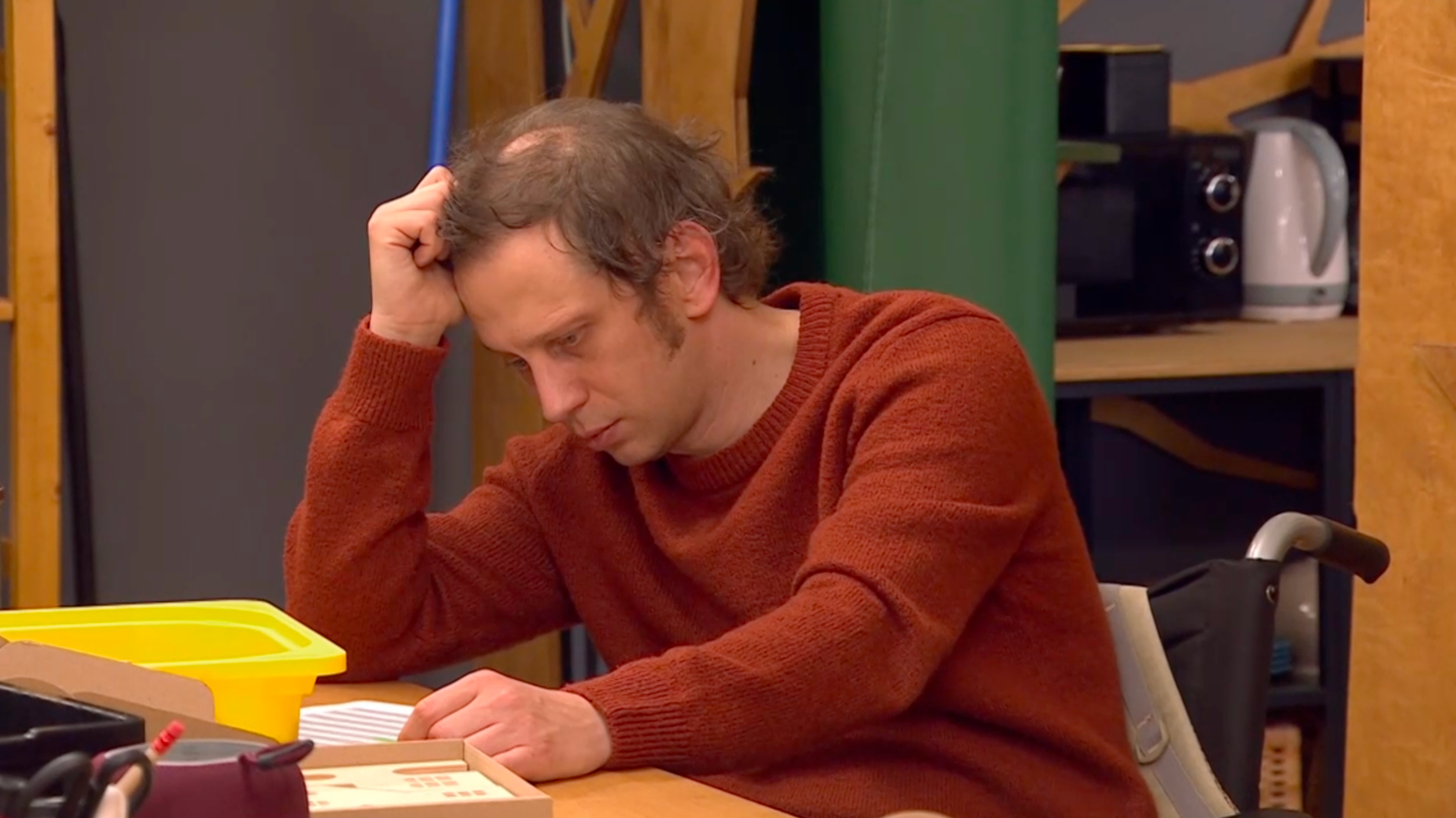Už na první pohled je patrné, že Lukáš není ve své kůži. Je zesláblý, unavený, ztrácí energii a reaguje pomaleji než obvykle. Přesto dál pracuje a přesvědčuje sebe i ostatní, že je všechno v pořádku. Kolega Rosťa, kterého hraje Jiří Černý, si jeho stavu všímá a snaží se situaci odlehčit vtipem. „Lukáši, abys do toho papíru nepropálil díru pohledem,“ utrousí s úsměvem.
